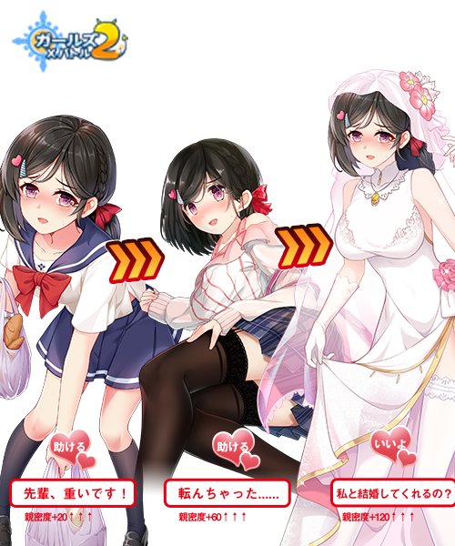 後輩と恋の仲を深めていくことによって、後輩との関係がどんどん発展していくよ。デートをすることができたり、ロマンチックな専用のストーリが追加されるよ好感度がマックスになると、後輩と誓約結んで、結婚の殿堂に進めるよ!